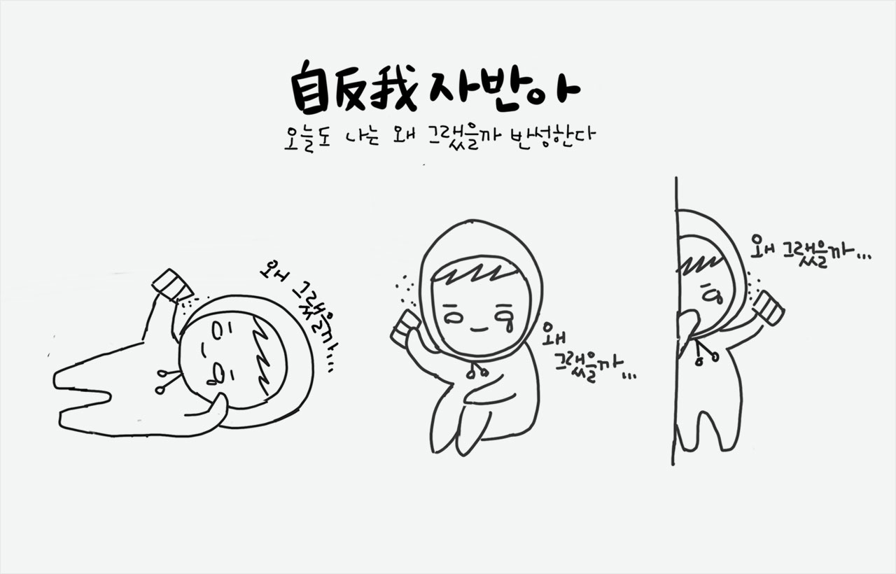 자기반성의 아이콘인 나를 캐릭터화 한 것인데. 줄여서 자반아다. 반성을 시도 때도 없이 하는 나 자신을 표현한 것인데 자기반성이 언젠간 자기 감사의 아이콘이 되길 늘 꿈꾸고 있다. 이모티콘으로 만들어서 카톡에 등록하면 재미있지 않을까 했는데 근근이 그리는 수준이라 이 정도로 우선 만족하기로.