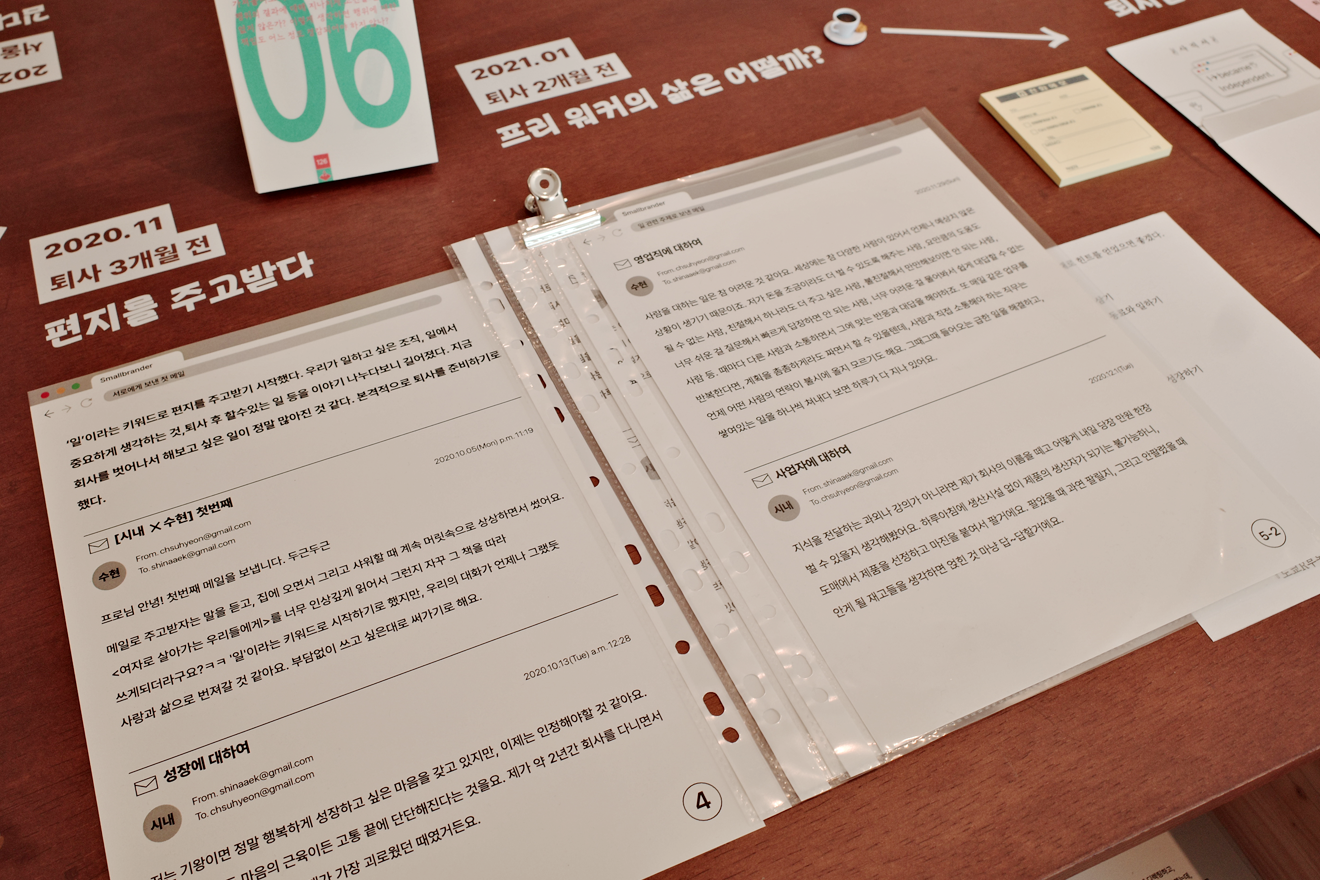 북토크 시작 전에 전시를 둘러보며 두 작가가 주고받은 메일과 타임라인을 훑어보았다. 타인의 메일을 이렇게 보게 될 줄은 몰랐는데, 메신저가 아닌 메일로 이야기를 주고받았다는 것이 인상적이었다. (나도 여기서 착안해서 퇴사한 지인과 메일을 주고받기 시작했다.)