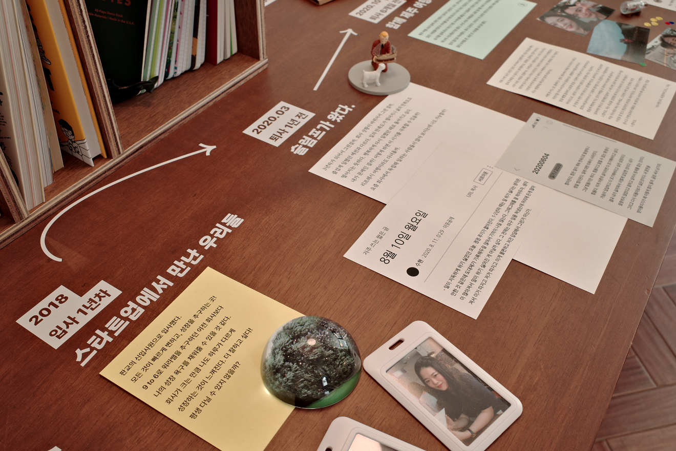 북토크는 전시에도 소개된 바 있는 타임라인을 따라가며 시작되었다. 서로 다르다고 생각한 두 사람이 제주도 여행에서 의외의 케미를 발견하고, 퇴사 후 '스몰브랜더'를 만들어가는 과정을 지켜보면서 글로 다 표현하지 못했을 '불안' '두려움'의 무게가 느껴지기도 했다. 해보지 않은 길은 누구나 불안감을 가질 수밖에 없으니까. 스몰브랜더를 만들고 얻은 오르고 내리는 수익을 도표로 그려놓은 장표를 볼 땐 그들이 선택한 후에도 얼마나 많은 고민을 했을지가 그려졌다. 나였다면 이겨낼 수 있었을까, 자문했다.
