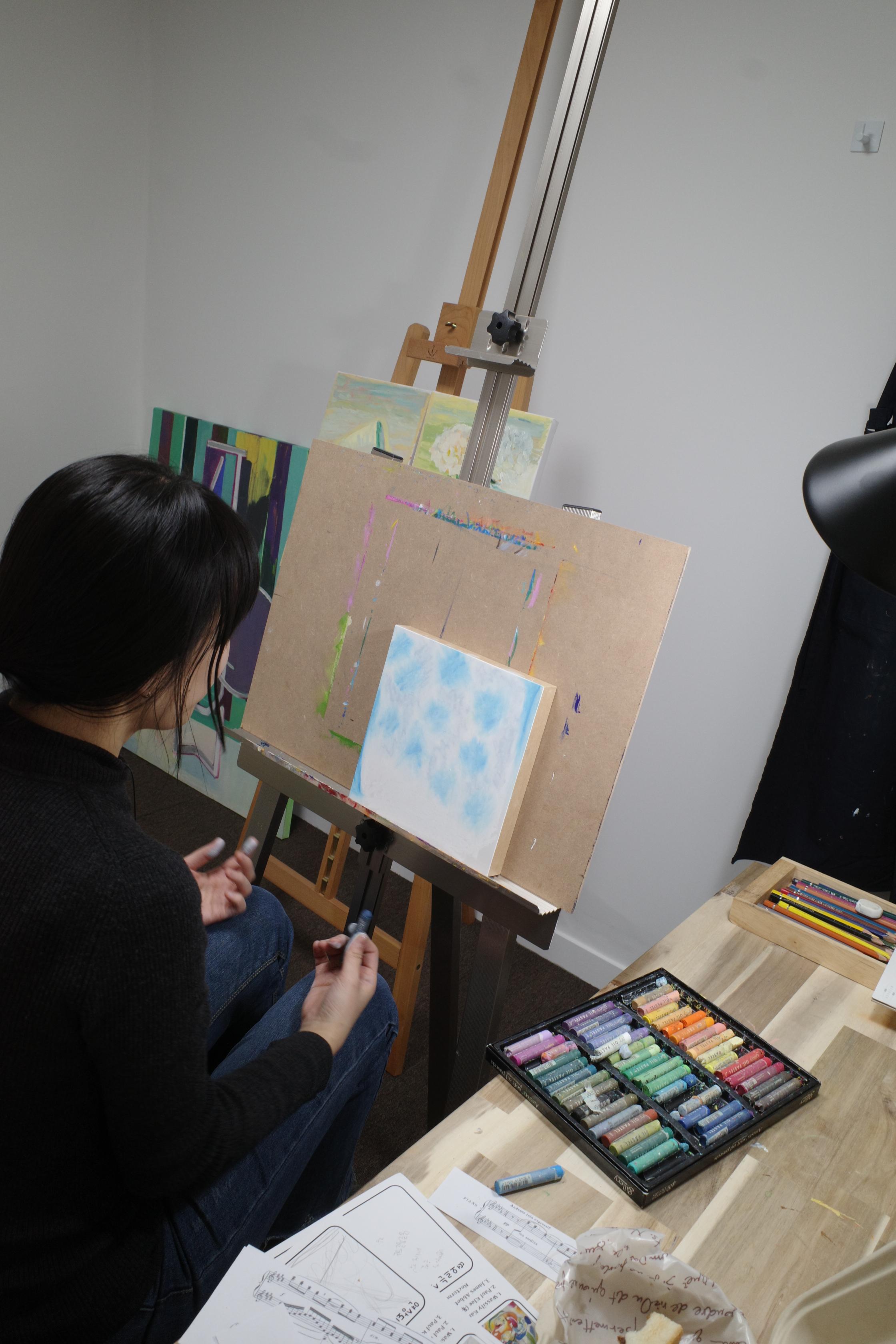 캔버스를 앞에두고 음악을 들으며 생각했던 것을 구쌤에게 설명했다. 선생님은 오일파스텔의 사용 방법에 대한 이야기를 하며 수정이 수월하니 마음껏 표현해도 좋다고 하시더라. 자유롭게라, 사실 그림을 그리는 것에 있어 가장 큰 두려움은 ‘망치는 것'인데 그런 부담을 조금이나마 내려놓을 수 있다는 것으로도 오일파스텔이 마음에 들었다.
