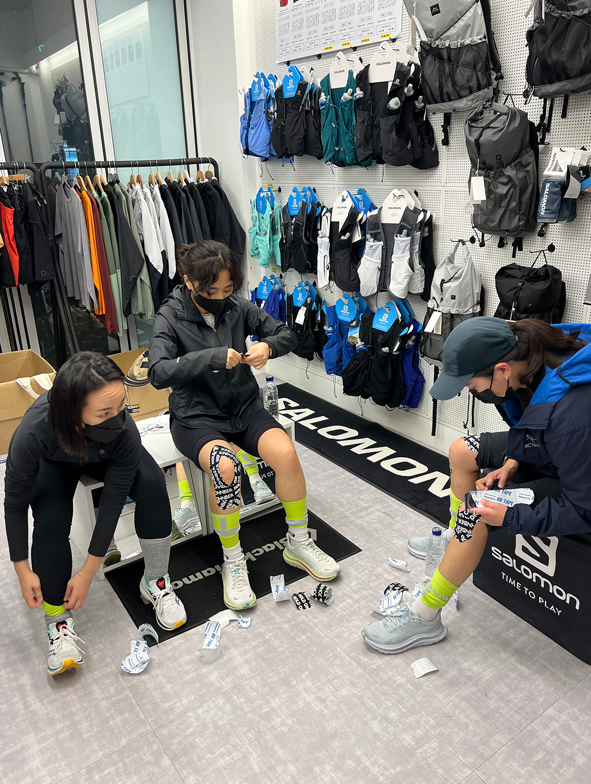 처음 보는 여성분들과 드디어 처음 만난 날, 굿러너컴퍼니에서 준비한 러닝용품을 받았다. 호카 카와나 운동화, cep 카프슬리브, Circle DNA 키트. (이후에 어시스트레치 50분 무료 이용권도!)
