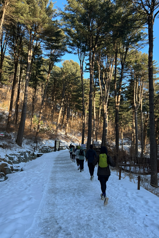 산에 본격적으로 오르기 전 재희님이 눈길을 달릴 때 주의해야 할 점을 알려주셨다. 어느정도 녹아 빙판이 된 곳보단 가장자리쪽(윤주님 표현을 빌려 ‘가생이’)을 밟는 것이 낫다는 것과 경사가 심한 내리막에서는 뒷꿈치쪽으로 중심을 옮겨서 내려온다는 것과.